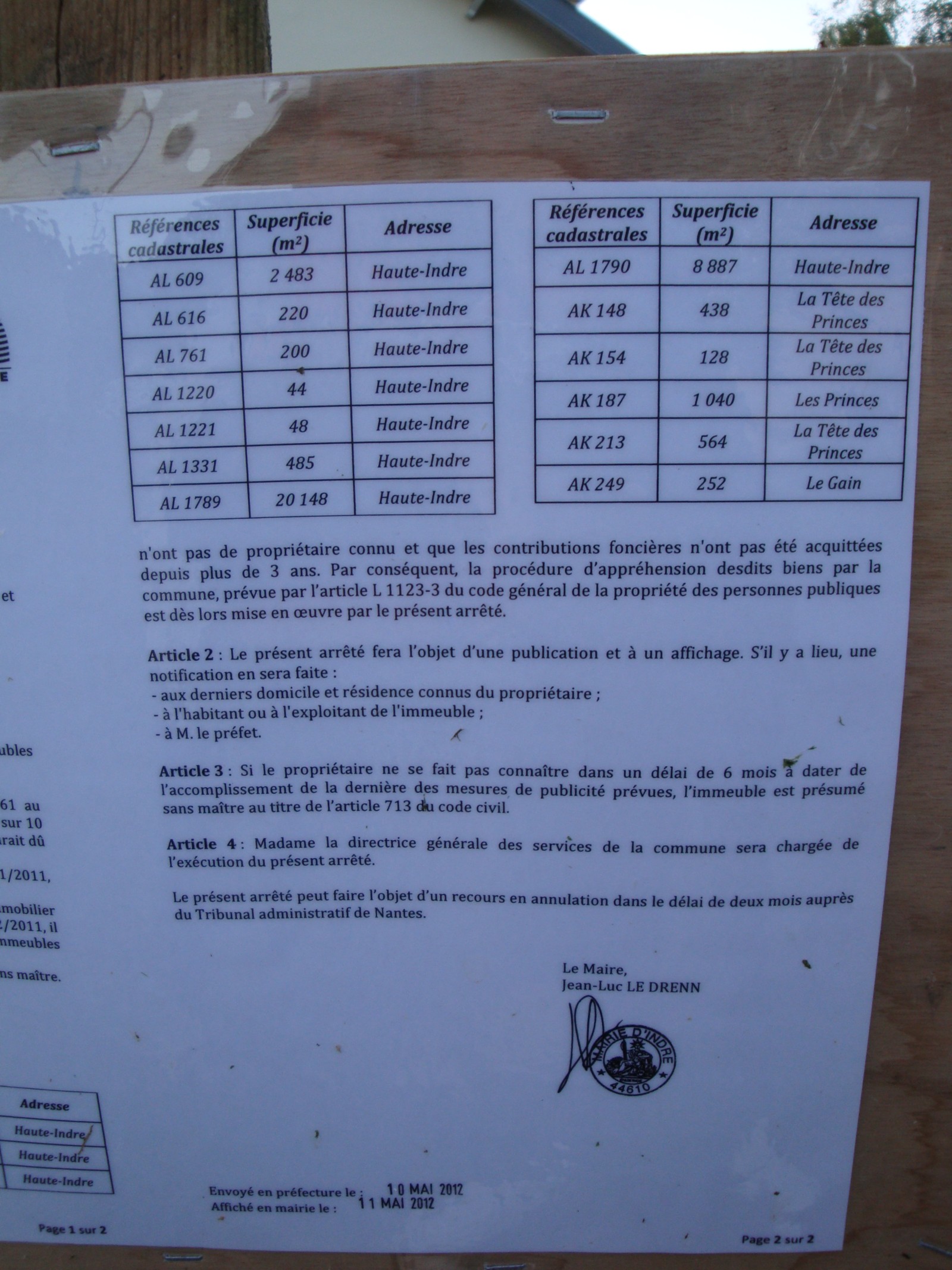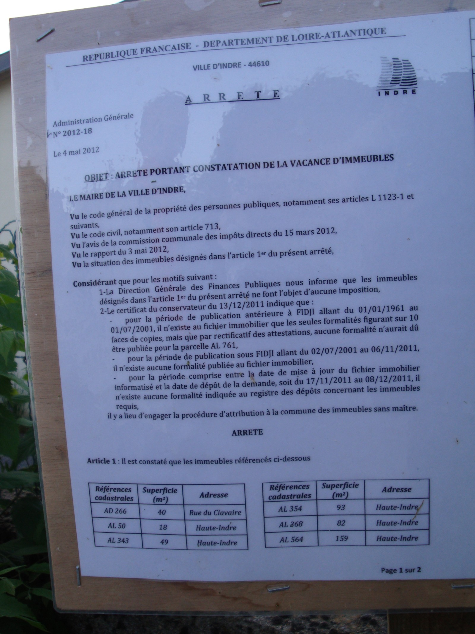 Tout le monde le sait maintenant, Nantes Métropole et la municipalité ont des vues sur nos parcelles de terrains à Haute Indre et il est bien naturel que les propriétaires de ces nombreuses parcelles soient invités à se faire connaître. Mais est-il bien normal d’afficher l« arrêté de constatation de la vacance d’immeubles » de la mairie sur le pignon d’une maison de la rue François Poisson qui n’est pas un lieu particulièrement fréquenté par les Indrais. La mairie n’aurait-elle pas pu afficher ce papier place Alphonse Guihot, par exemple, où les habitants étaient encore réunis hier soir et surtout nous en informer, nous les représentants de l’ADRHI ? En effet, ce papier est daté du 4 mai 2012 et nous avons rencontré monsieur le maire le 2 mai ! Rappelez-vous également de la réunion publique organisée à Haute Indre par la mairie le 29 mai 2012 : a-t-il été question de ces terrains ??? Il y a là un manque d’information évident auquel nous nous devons de remédier.