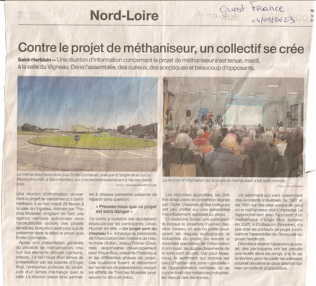 Plus d’une centaine de personnes à notre réunion d’information du 17 avril 2023, des représentants des communes voisines, Saint Herblain, Roche Maurice, Sautron … Malgré l’allocution du président Macron à la TV et le début des vacances scolaires, nous avons fait pratiquement salle comble. On a parlé du méthaniseur prévu à Saint Herblain sans langue de bois, comme prévu.