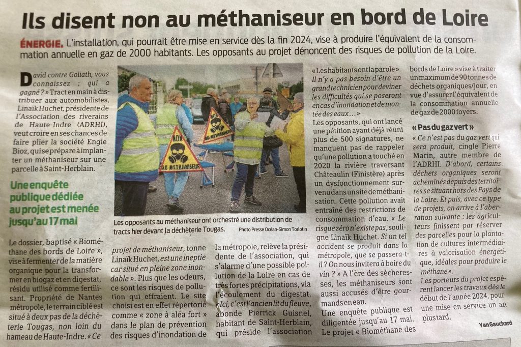 C’est suite aux conclusions de cette enquête que le préfet prendra sa décision : méthaniseur là ou pas. C’est pourquoi nous vous invitons à déposer un maximum d’avis par écrit, soit sur le registre du commissaire enquêteur à St Herblain, soit sur le registre numérique en cliquant sur ce lien : registre dématérialisé